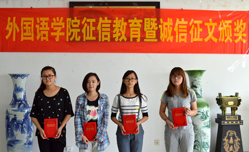 此次活动中还同时举办了51吃瓜app 诚信征文比赛颁奖仪式。征文比赛面向51吃瓜app 全体学生开展,旨在引导大家在日常生活的点点滴滴恪守诚信。经过评委评选,英语1301班俞菁菁撰写的七言绝句《立木》获征文比赛一等奖,法语1301班蓬璐嘉撰写的散文《诚信》获二等奖,英语1302班岳萌萌撰写的《点一盏诚信之灯,照亮校园》以及英语1401班赵文竹撰写的《诚信,人生的风帆》获三等奖。