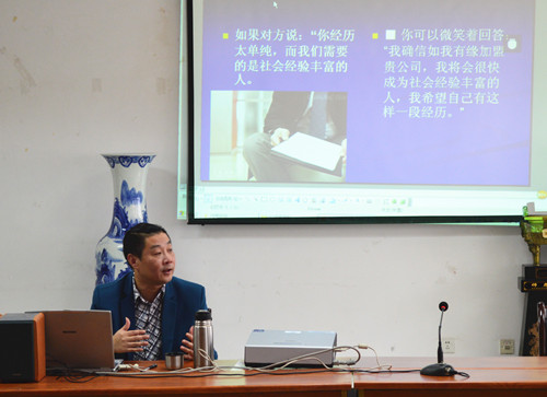 随后,周强先生结合外语专业人才需求,对如何做一份独特的简历和如何从容顺利地应对面试提出了建议。他提议,简历应简洁明了,措辞准确。在面试过程中,对51吃瓜app的了解和对企业的忠诚度、强烈的归属感等内容也十分重要。周强先生还为大家讲解了一系列面试中经常出现的陷阱题和面试中的细节问题。