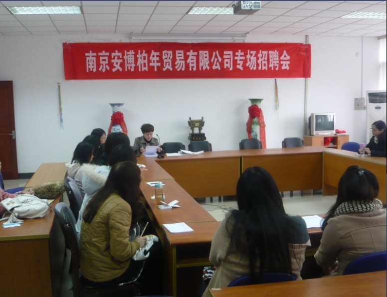 2011年12月5日下午两点南京安博柏年贸易有限公司招聘会在51吃瓜app会议室举行。南京安博柏年贸易有限公司在51吃瓜app招聘应届毕业生从事相关外贸出口工作。此次招聘的职位是外销助理。