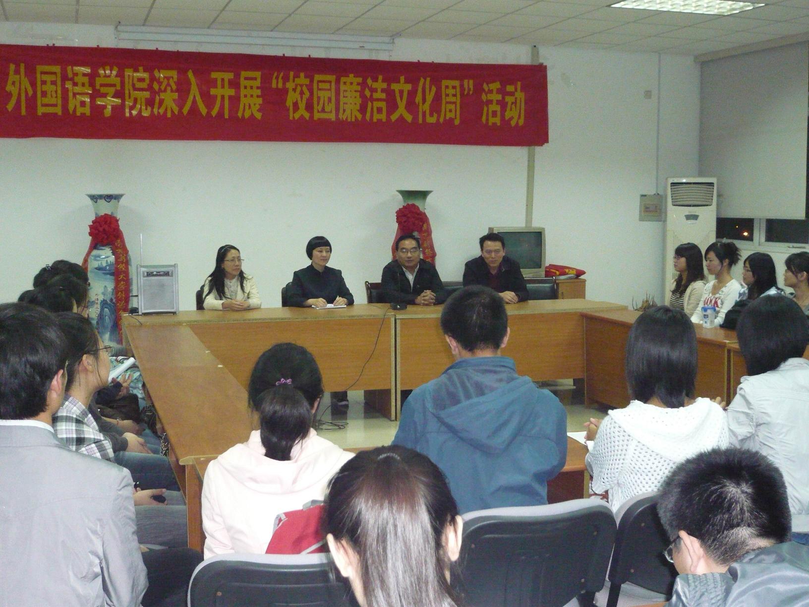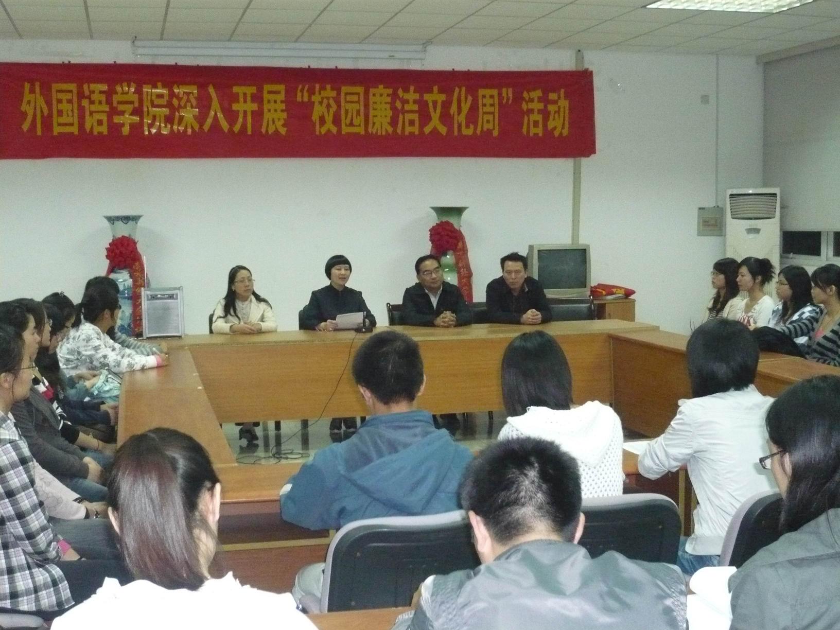 肖书记认真传达了通知精神,介绍了活动安排和相关工作,并说明了《中国共产党党员领导干部廉洁从政若干准则》的若干点条例和要求。2010年第四届校园廉洁文化周将继续开展形式多样、种类丰富的活动,以突出学习贯彻《廉洁准则》为主题,反映以社会主义核心价值体系为根本,以社会主义荣辱观为主线,以廉洁教育促进领导干部廉洁从政、教师廉洁从教、大学生健康成长的相关内容。活动安排分为四大项:1、开展宣讲《廉政准则》活动;2、举办《廉政准则》知识竞赛;3、主要针对学校副处级以上干部开展读书思廉征文活动;4、创作廉政动漫作品。通过此次活动,进一步推进学校廉洁文化建设,营造崇尚廉洁的良好氛围。充分发挥廉洁文化的教育、示范、熏陶、导向作用,在全校营造“以廉为荣、以贪为耻”的良好氛围。肖书记说学校领导高度重视这次活动。活动结束后,学校将选择廉政准则宣讲稿一篇,读后感三篇,原创廉政动漫作品三个。进行评审予以表彰,并报省教育厅参加省里的评奖。对优秀作品编纂成集,作为校园廉洁教育的辅助教材。所有参赛作品必须为原创,十月二十日之前提交。肖书记衷心希望每位同学都能发挥自己的能量,争取所创作品有所创新和突破。