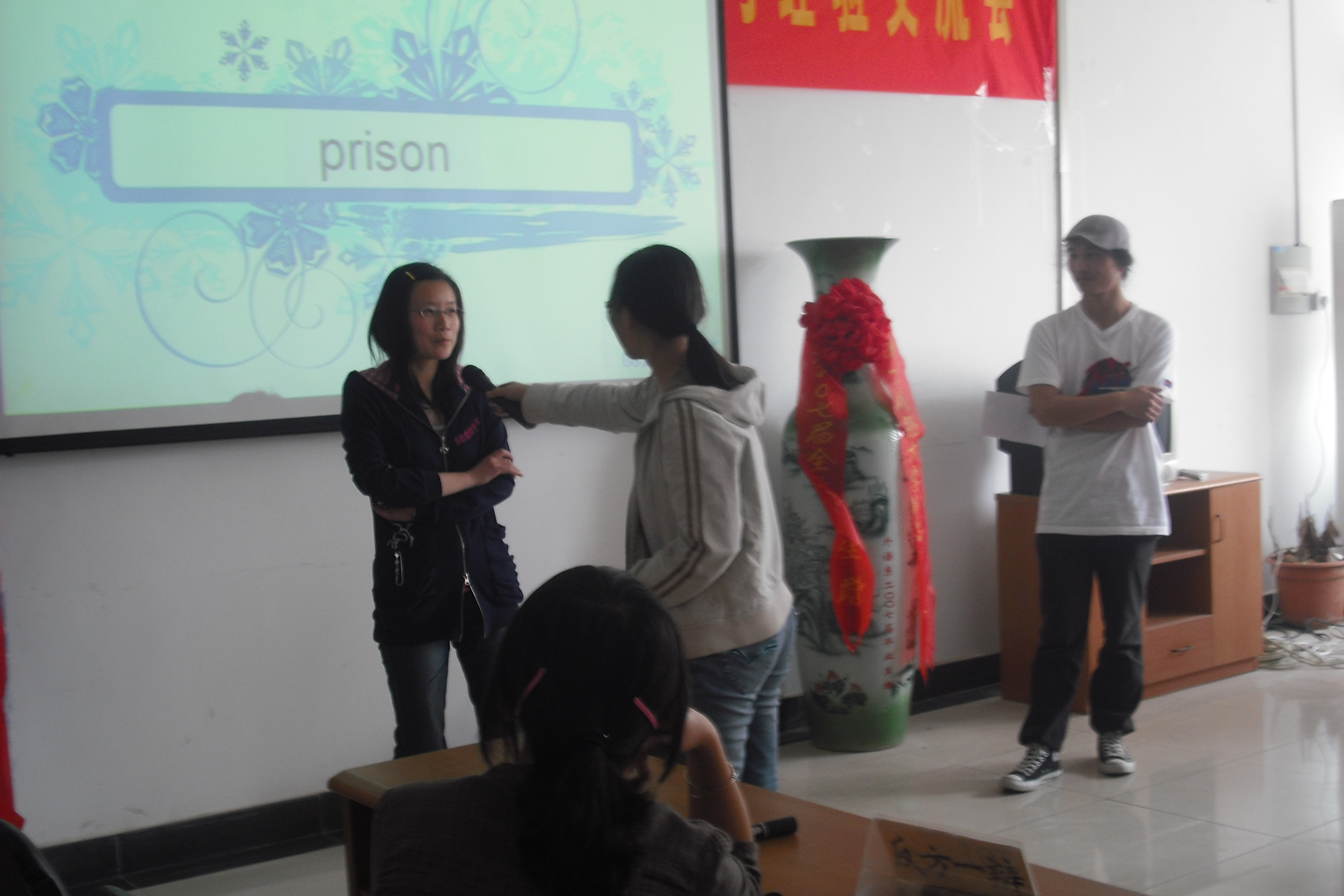 选手们凭借着平日里广泛阅读打下的坚实基础,轻车熟路地走过了选择题、判断题和简答题,些许的犹豫也毕竟还有幸运的垂青助其一臂之力。于是选手们踌躇满志地期待着在下一环节中大展拳脚。紧接着的是速战速决的猜词环节,每队派两名选手一人用动作和英语描述单词,另一人凭此猜出所示单词。082的选手采用反义及同义词这一极为有效的战略并辅以简明有力的肢体动作顺利攻克此难题,实力超强的两位选手配合十分默契,在短短的60秒就轻松自如地攻下不少单词。台下屏息凝神的观众貌似更加紧张,雷鸣般的掌声在60秒的沉默之后如骤雨狂袭而来,大家会心的笑靥使得比赛场上的气氛缓和了不少。