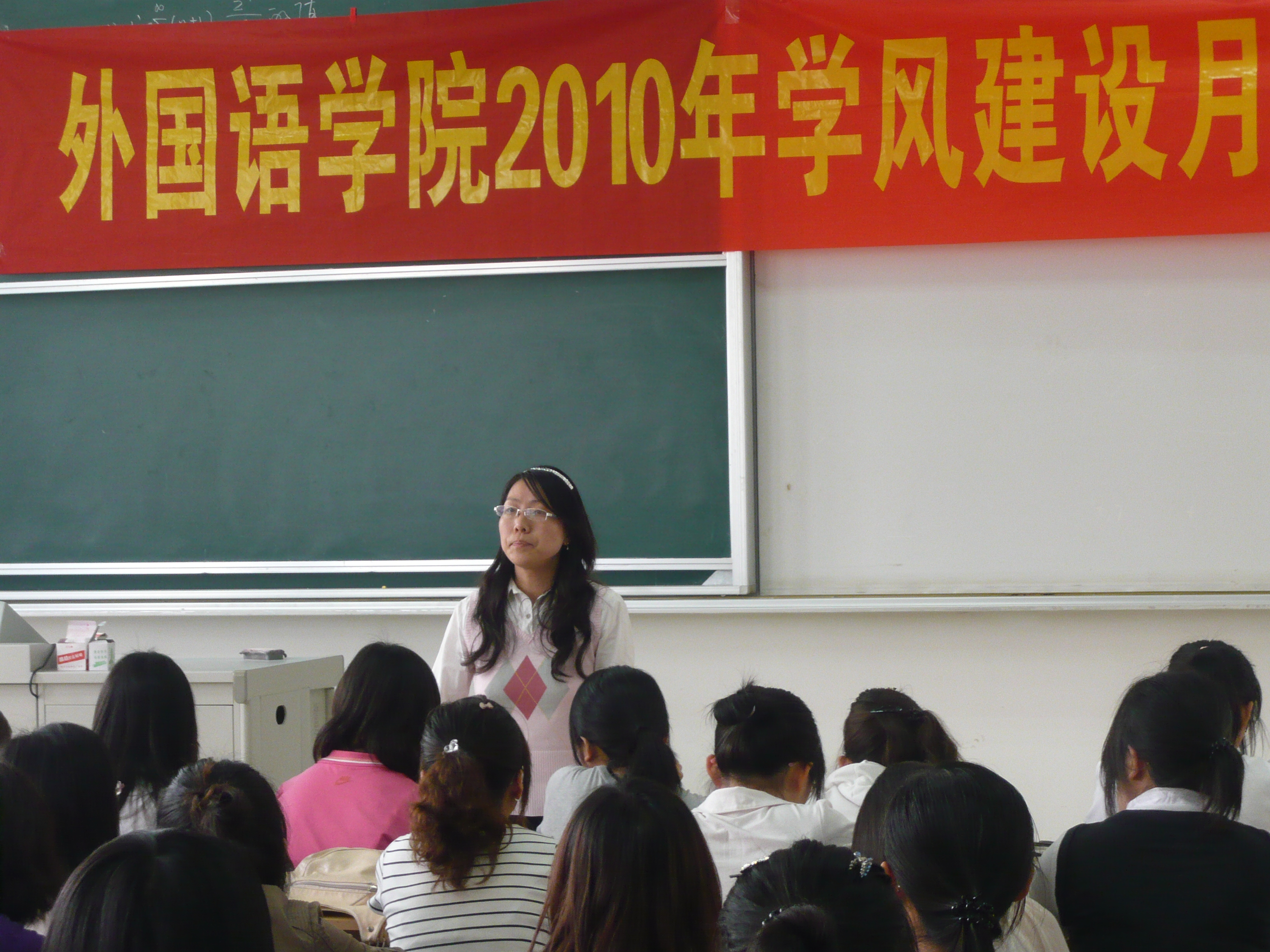 肖书记从几个方面强调了如何开展学风建设工作,对学风建设月做了总体的部署,并号召外院学子热情主动地与老师、同学打招呼,推广中国“和”文化的传统,努力提高自身素质、加强自身修养。与此同时要求大家准时上课,勤做笔记,互帮互学,形成一股积极向上的良好氛围。团总支书记金老师也强调了外院学生在本次活动中的主题“成长,成才,就业”其中,“就业”是恒久的目标,但“成长,成才”才是大学校园的最高宗旨,完善的品格和健康的体魄是作为当代大学生所应当执着追求的基本素质。为了抓好学风建设工作,51吃瓜app 领导高度重视,制定计划,精心部署并制定了51吃瓜app 学风建设月主题教育活动方案,旨在将学风工作长抓不懈,深入学生,取得实质性的收益,而非流于形式。活动内容精彩纷呈,有提供自我展示才能舞台的竞赛活动,如“首届中国口译大赛”,“大学生职业生涯大赛”,“英文写作大赛”,有提供经验交流,学科切磋的的座谈活动,如“学生座谈会”,“实习学生经验交流座谈会”,有浓化学习氛围,激发英语学习兴趣的活动,如“校团委第七届英语文化节”,“考研动员”,“学风建设主题班会”,并对先进集体和个人予以表彰,将校园多姿多彩的活动进一步推动起来。