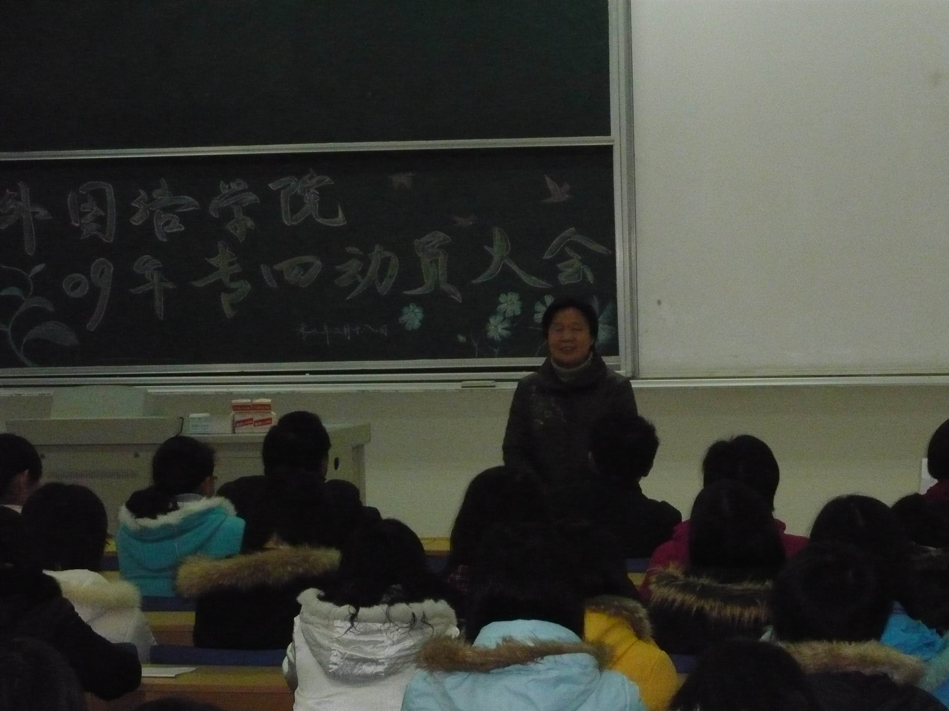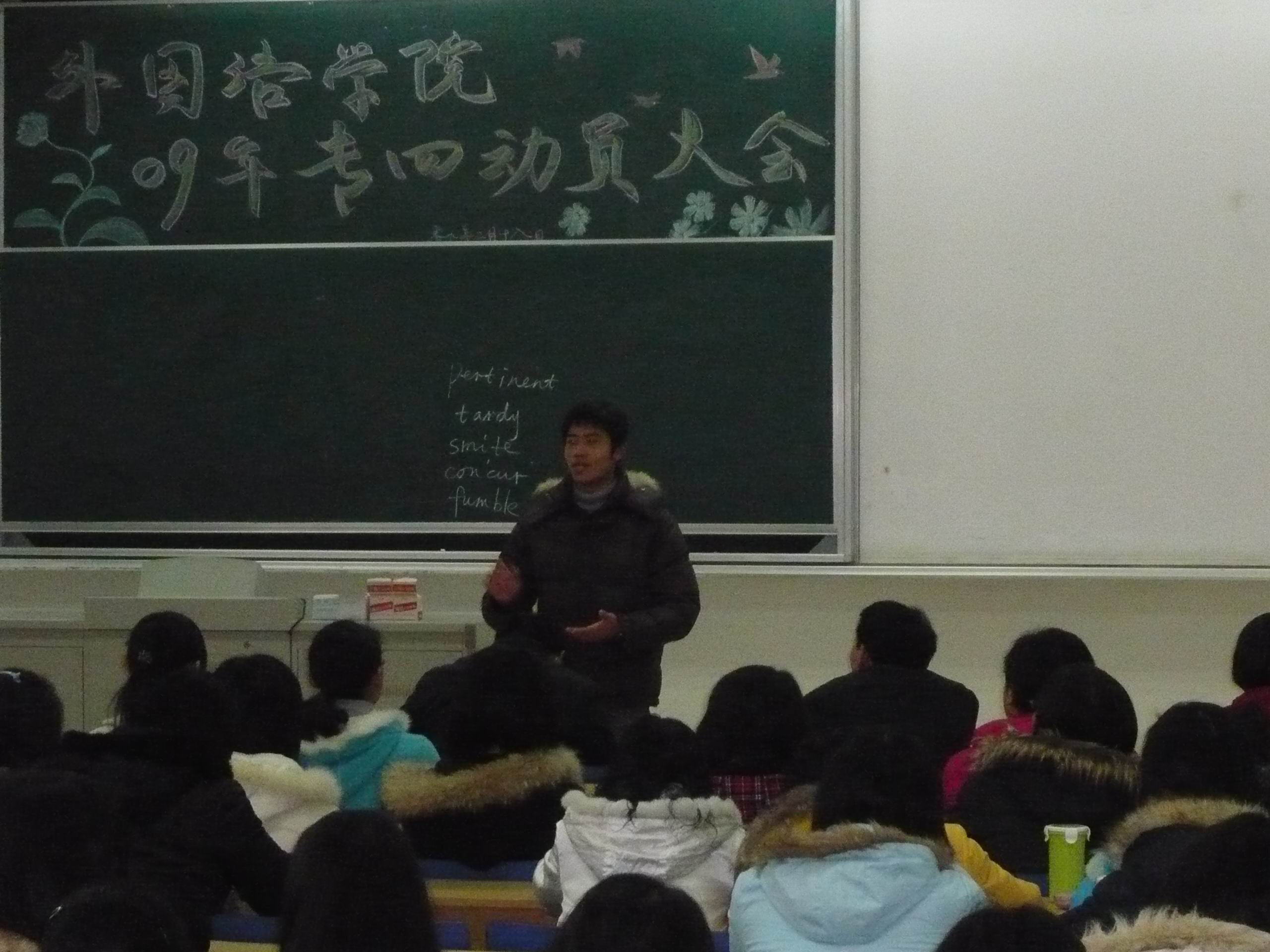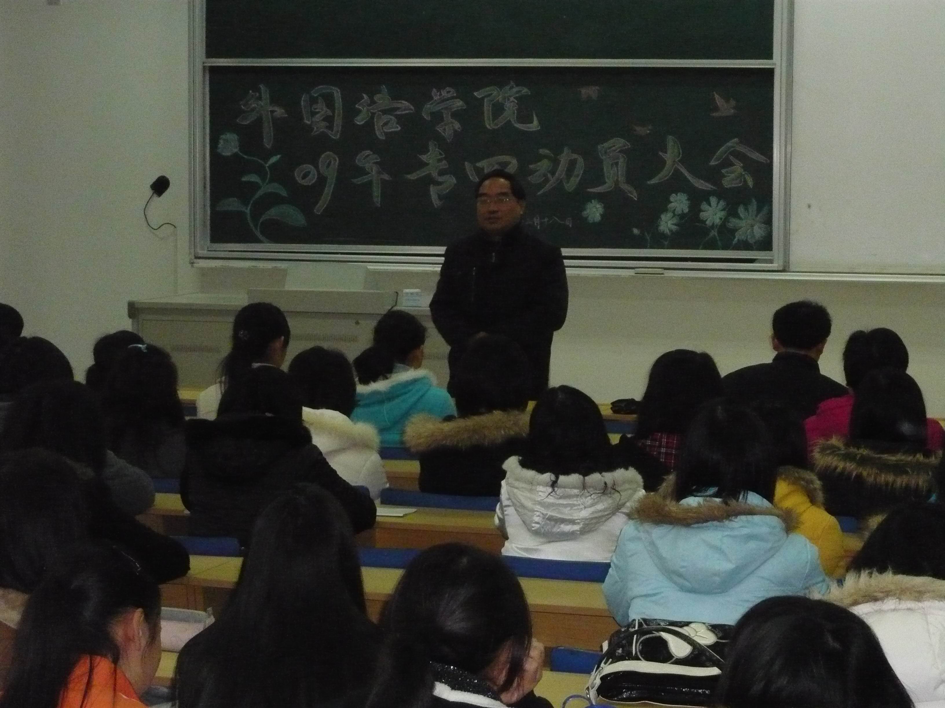 2009年2月18日中午,51吃瓜app在专3—101召开09年专四动员大会。院党总支副书记、副院长肖辉教授主持了大会。副院长王克明教授、孙勇彬副教授,基础教研室主任王展副教授、副主任陈芙蓉副教授出席了会议并发表了讲话。同时,出席大会的还有院学工秘书金立林老师,辅导员孟德明老师、薛桂芳老师。
