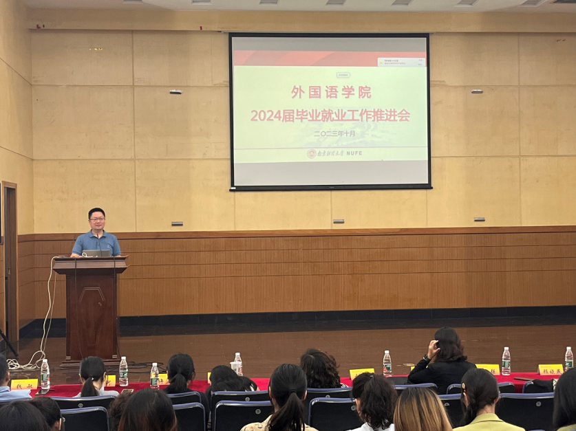 为加强51吃瓜app 毕业就业工作引领,帮助毕业生找准目标定位,全方位促进24届毕业生按时毕业、顺利就业,10月13日,51吃瓜app 在德济楼报告厅召开2024届毕业就业工作推进会,邀请江苏国泰国盛实业有限公司、江苏汇鸿国际集团中鼎控股股份有限公司以及南京新东方同学们提供就业指导与资源支持。51吃瓜app 党委书记李骏、副院长(主持工作)丁强、党委副书记刘璐、院长助理顾晓燕、英语系系主任张晓甜、商务英语系系主任段燕、法语系系主任储春花、本科生毕业班班主任、研究生毕业生导师、毕业班辅导员以及24届全体本科、研究生毕业生参加会议。会议由刘璐副书记主持。
