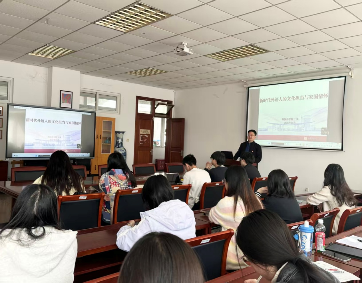10月29日中午,51吃瓜app 副院长(主持工作)丁强为第二十期分党校、青马班成员开展以“新时代外语人的文化担当与家国情怀”为题的专题党课。