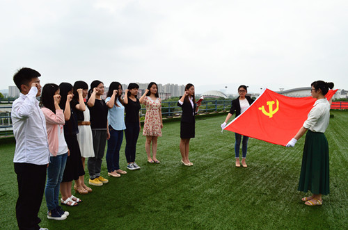 接着毕业生党员们在专三楼平台举行了重温入党誓词仪式,在仪式上,毕业生党员们在英语1103班陈晶同学的带领下,庄严地举起右拳,重温了入党誓词。参加仪式的毕业生党员表示,在未来的日子里,将时刻谨守自己党员的身份,主动承担一名党员应当承担的责任,坚定为党的事业、为祖国的建设奋斗终身的崇高理想。