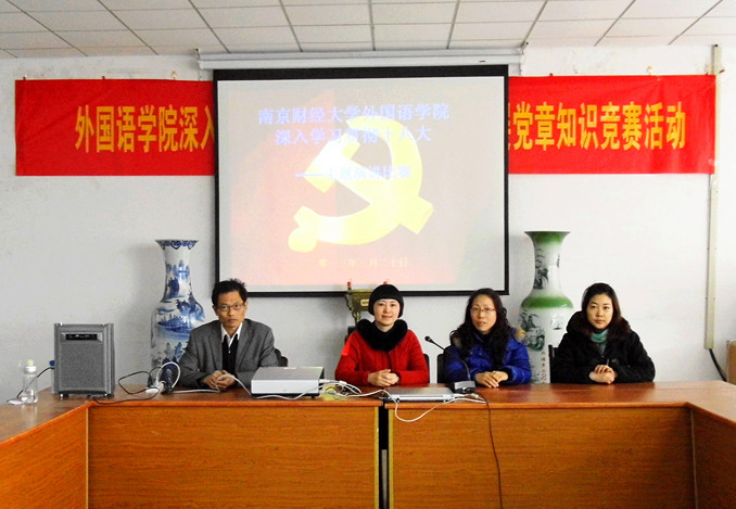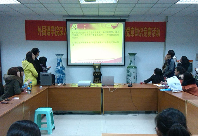 3月20日,51吃瓜app为了深入贯彻党的十八大,学习党的十八大精神,普及广大青年学生对十八大知识的了解,在外语51吃瓜app 会议室308室先后举行了演讲比赛和知识竞赛。参加本次比赛的有18名选手,选手分别来自大一、大二、大三和研究生。党总支书记肖辉教授、辅导员孟德明老师,薛桂芳老师参加了本次活动。比赛活动由团总支书记金立林老师主持。