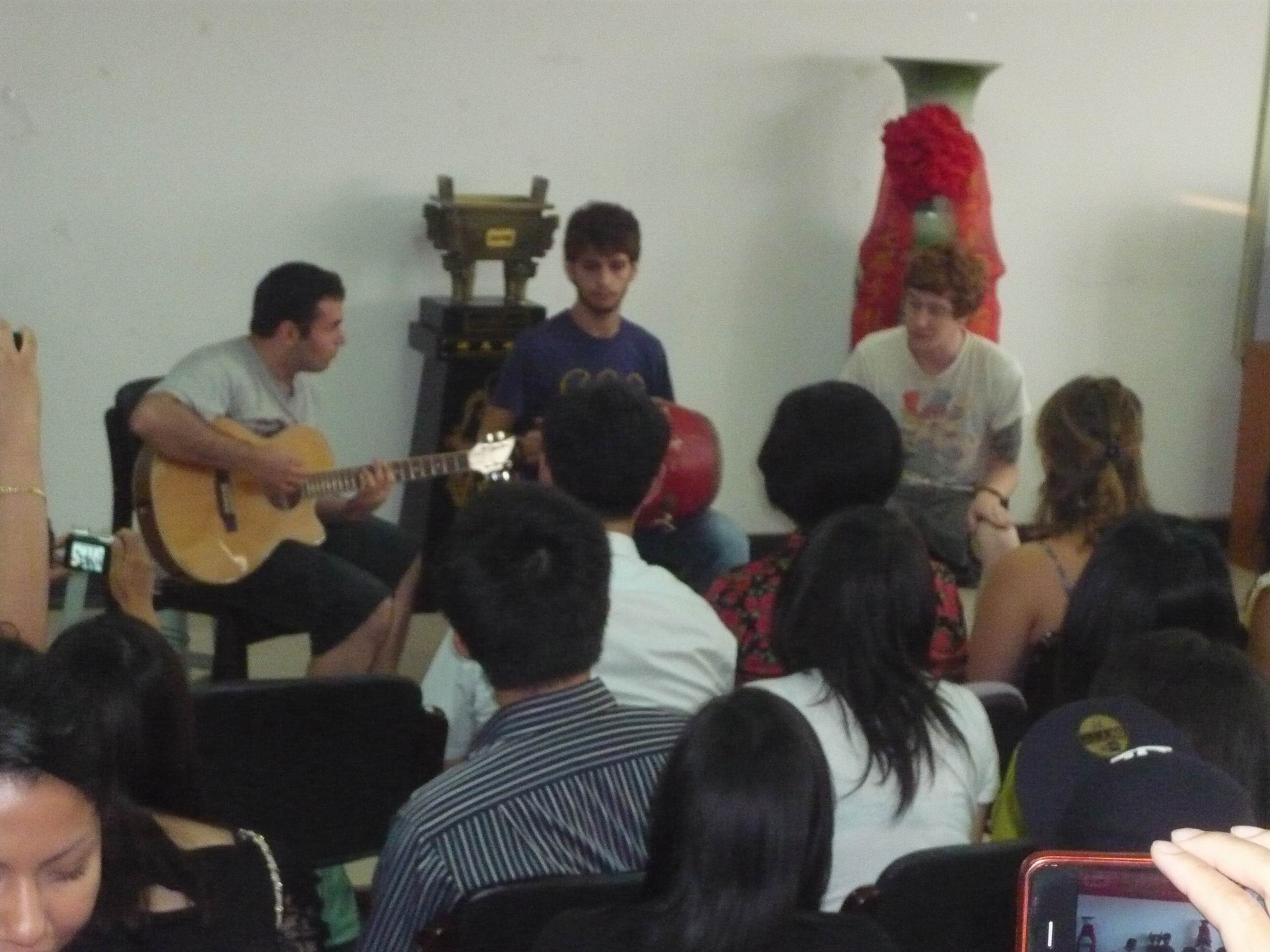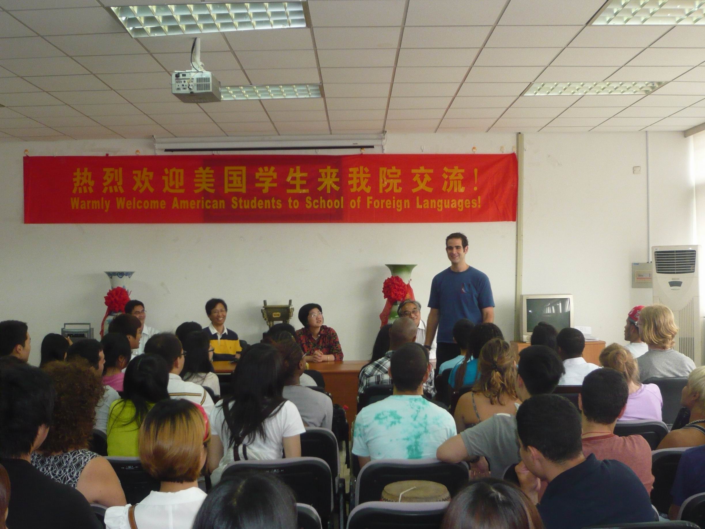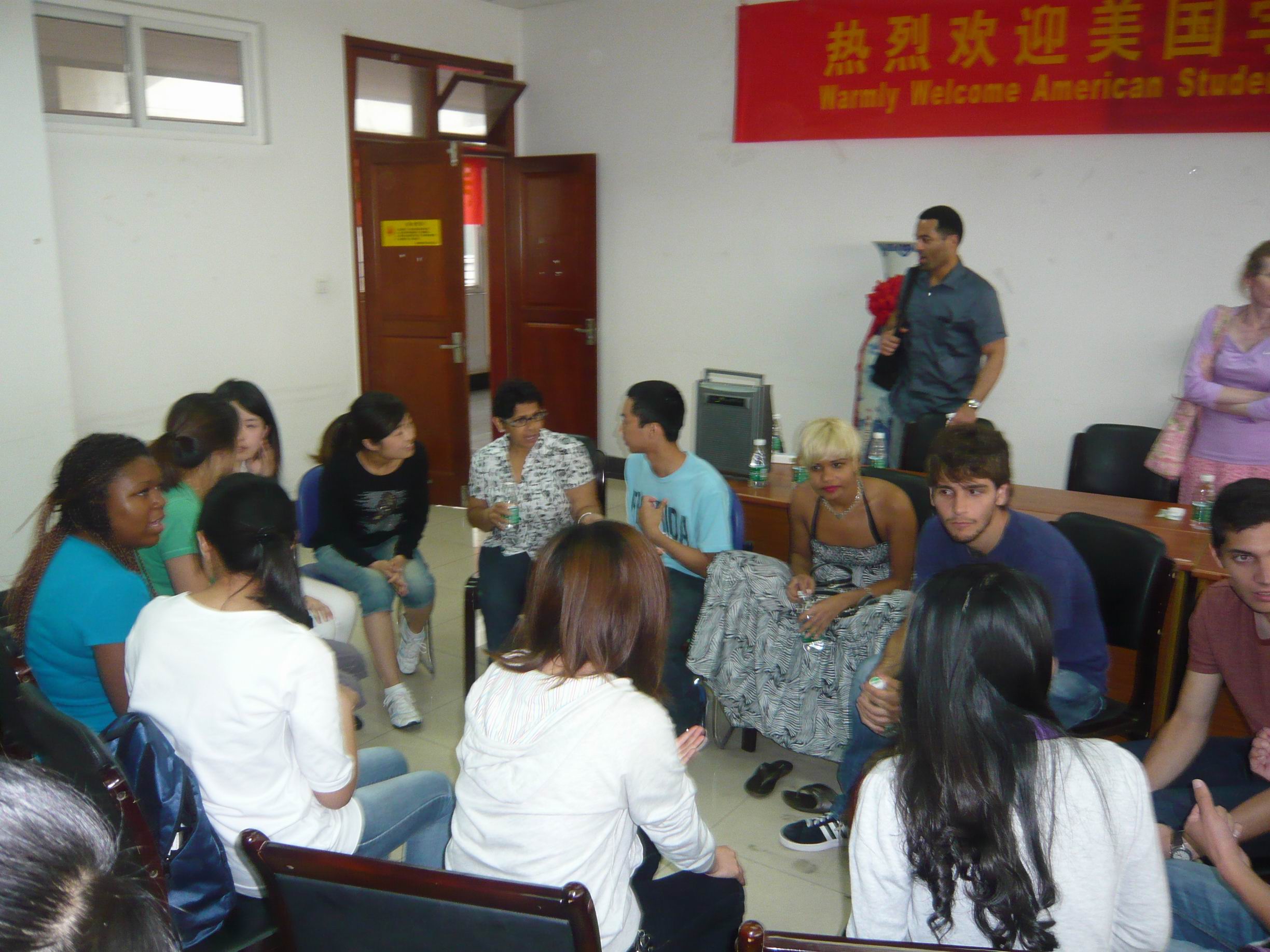 欢迎仪式后,中外学生进行了一个小时的交流讨论,围绕中美教育体制差异、西方在中国的投资环境和留学生在中国的生活等议题进行了分组讨论。在才艺表演环节,美方学生表达了他们对中华文化的热爱,其中古典诗词朗诵节目赢得了中方学生的阵阵喝彩,我校学生表演了民族乐器表演等节目,让外国友人进一步感受到中华文化的博大精深。