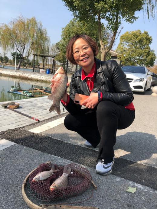 上午9:00,选手们进入各自的钓位,随着裁判长一声令下,钓鱼比赛正式开始。参赛选手们摆开阵势,打开钓竿,挂上鱼饵,纷纷抛竿。大家个个兴致高昂,他们中有经验丰富、动作娴熟的钓鱼老手,也有刚刚接触钓鱼的新人。为取得好成绩,选手们各显身手,专业的渔具、秘制的饵料,为吸引鱼儿上钩忙得不亦乐乎。陈芙蓉老师虽然是新手,但是她不急不躁,耐心地等待鱼儿上钩。终于,浮子动了,一下,两下,三下。。。一条一斤重的大鲫鱼被钓了上来。功夫不负有心人,最终,陈芙蓉老师收获了三条大鲫鱼。
